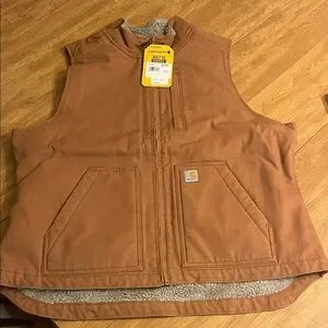 Durable Carhartt vest with a rugged design. Ideal for outdoor activities. Features warm lining and practical pockets.