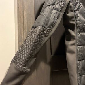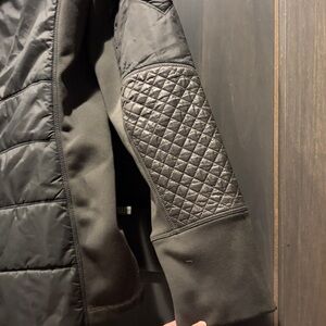 Stylish quilted design. Warm and comfortable. Perfect for chilly days. Dark olive green color. Size medium. Adjustable hood. Side pockets.