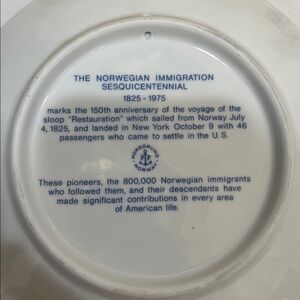 Porsgrund of Norway commemorative plate. “The Norwegian Immigration Sesquicentennial 1825-1975”. Limited edition plate. Excellent condition!
