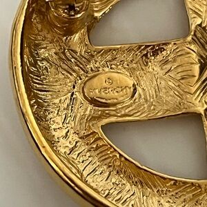 Elegant gold brooch featuring a designer logo. Perfect for adding a touch of luxury to any outfit. Signature on back, in EUC.