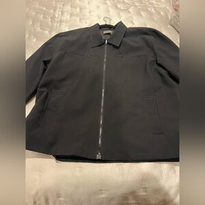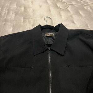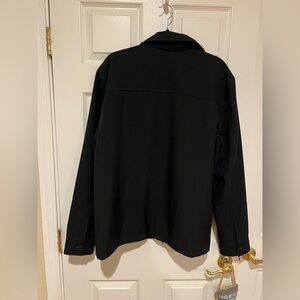 Men’s Sleek black shirt jacket. Lightweight design. Ideal for layering. It has side seam pockets as well as zippered welt pockets.