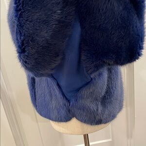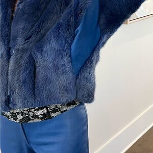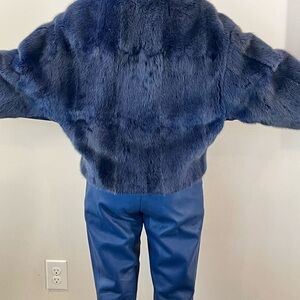 Stay cozy and stylish with this elegant blue teddy jacket, perfect for any occasion. Botton closure. Side pockets. Custom made with Italian fur and leather. Excellent condition. Great with denim. Fully lined with satin fabric.