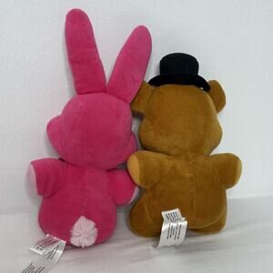 Includes two plush figures: 1 pink Bonnet bunny (Sister Location) with red bow tie, 1 brown Freddy bear with black bow tie and black top hat