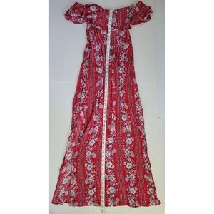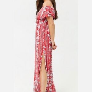 Forever 21 Red Floral Cottagecore Slubbed Cotton Off Shoulder Maxi Dress