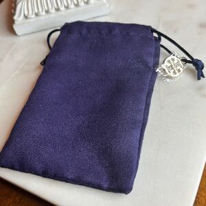 Lovely blue velvet drawstring jewelry pouch with a gold logo accent. Ideal for jewelry or small card holders.