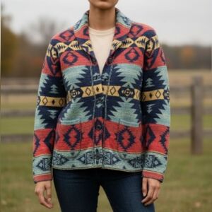 Vibrant Denim & Supply Ralph Lauren cardigan with bold Aztec geometric Southwestern patterns. Features button front closure and shawl collaron this sylish boho cardigan sweater. Perfect for layering.
