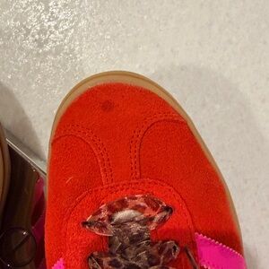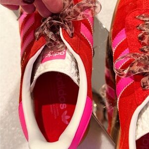 Bold and fun Adidas red suede sneakers with hot pink stripes and a gum sole. Size women’s 9.5. This pair has a plush white tongue, bright pink heel detail, and a super comfortable platform-style sole. They’re clean, authentic, and in great pre-owned condition. Leopard ribbon laces are included as a bonus style option. Theres a spot on the front as seen in the pics.