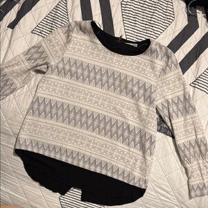 Stylish Pleione blouse with geometric patterns. Features a black and cream color scheme. Perfect for casual or office wear.