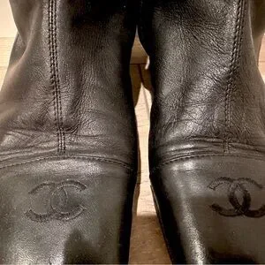 Rock this holiday season in these Vintage CHANEL mid calf boots. All the classic features you expect including the smooth soft leather hand with CHANEL logo at back of heel, atop the toes, and at zipper pull. Zippers flow smoothly. Some wear but lots of good times to be had in these boots. Label reads 9 but easily fits 8.5 too. Smoke free and pet free home.