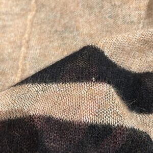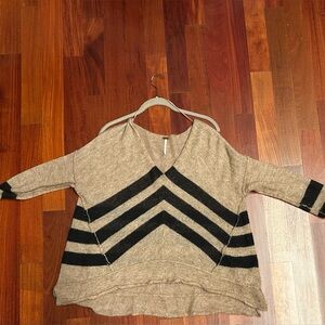 Cozy V-neck sweater with bold black stripes. Soft and has looser weave for a sheer effect. I typically wore it with one of the Free People lace bra or a tank. Intentionally large exterior seam down the back, by the arms and sides. It is meant to have an oversized fit