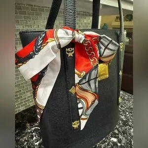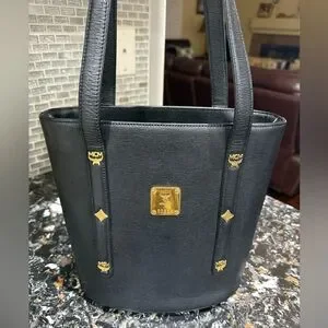 Elevate your style with this MCM Munchen black leather bucket tote bag. Featuring gold hardware and accents , this bag is perfect for any occasion.