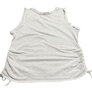 Light gray top with ruched sides with ties and a cuffed sleeveless look.