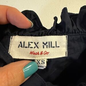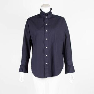 Alex Mill Navy Ruffle Neck Blouse Womens XS Cotton Elegant Trendy Button Up