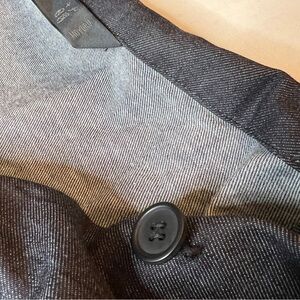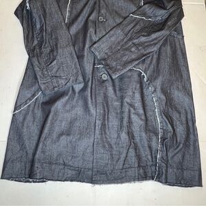 Contemporary. Artistic. Sophisticated. Comfortable. This is stylish and unique trench coat by Japanese fashion company Moyuru. Button down layout with two side pockets. Can be worn multiple ways to suit your mood. Dark blue / indigo denim. 100% cotton. Hard to find.