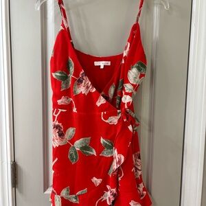 Chic red romper with floral design. Features a wrap style and sleeveless cut. Ideal for casual outings.