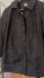 This is a women's black Chico's coat, size 0. It is made of a textured woven jacquard fabric. The coat has a collared neckline, long sleeves, and a button-front closure. It features a center back vent and measures approximately 36 inches in length.