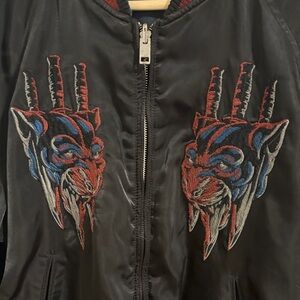 Stylish black bomber jacket featuring intricate embroidery. Perfect for a bold look. Double wear with two distinct styles.