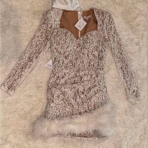 Chic long sleeve lace dress. Features elegant feather trim. Perfect for special occasions. New without tag!