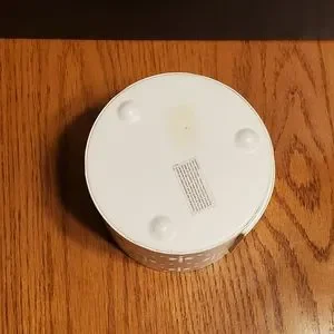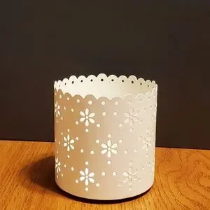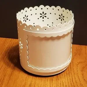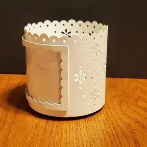 Yankee Candle, metal, eyelet lace, die / lazer cut, scalloped edge, picture frame, large candle holder. Approximately 4" diameter and 4" tall. Holds a 5"x3" photo. Gently used. This holds a photo! Although it is not bad, for full disclosure, there's a plastic insert (clear cover for photos) which has minor scratches. Cleaning the plastic is left up to the buyer so it don't scratch more. It can be used without this of course and is not necessary to hold in the picture. Photos slide into a track. Or you could simply cut a new piece of thin plastic.