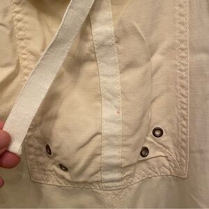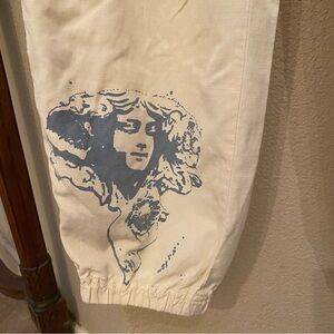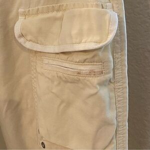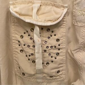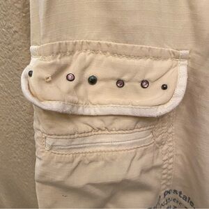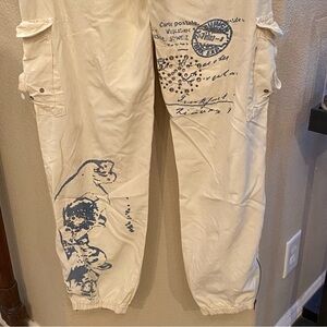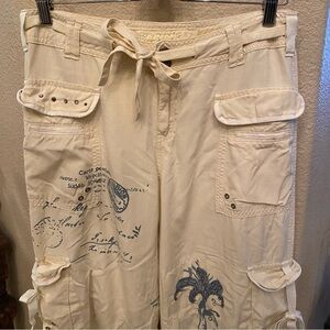Pre-owned in great condition with no rips but has normal wear. There are light stains on both of the back pockets and front left pocket as shown in pictures. Also the front right pocket is missing a stud/rhinestone. Women’s vintage light yellow cargo pants with fun graphics and embellishments. Comes from smoke and pet free home.