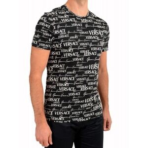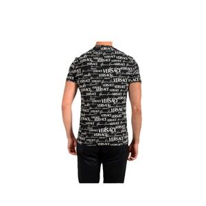 The Versace Gianni Logo Print T-Shirt in Black and White is a stylish and authentic piece of men's clothing. Made from comfortable cotton material, this short sleeve t-shirt features an all-over logo print design that adds a colorful and trendy touch. The XS size and regular fit make it a versatile and fashionable option for everyday wear. The inclusion of an NFC tag adds a unique and modern element to this high-quality Versace t-shirt.