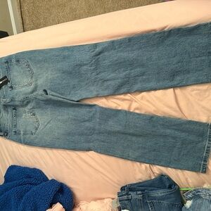 Trendy light blue flare jeans with distressed details. Perfect for a casual look. Comfortable and stylish.