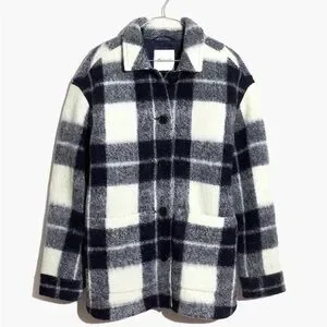 Made of fuzzy brushed bouclé from Italy, this perfectly oversized jacket is styled like a vintage men's plaid shirt with drop shoulders and buttons down the front. Big patch pockets mean you can stash your essentials for a run to the store (or keep your phone close when you're staying cozy inside).