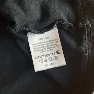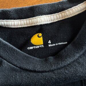Carhartt long-sleeve black shirt with pocket and logo patch on the front, and realistic deer illustration on the back in brown and white. Kids' size 4. 100% cotton. GUC; some all-over wash wear, and the graphic has some cracking and wear (see close photos).
