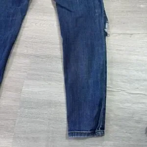 Item: Womens skinny jeans in a blue dark-wash denim with significant distressing.