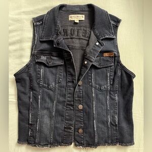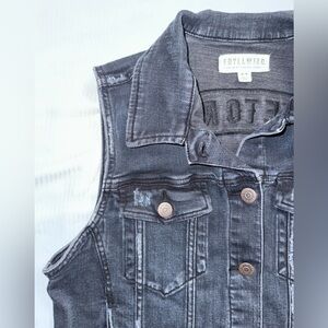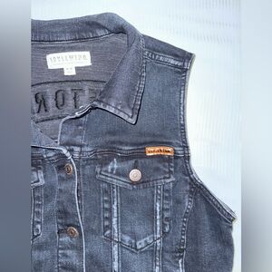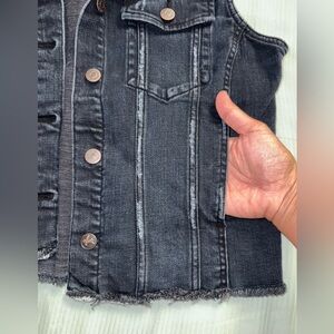 Blue distressed denim almost looks black. Perfect for layering. Button pockets on chest, side pockets fits the big cell phone.