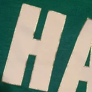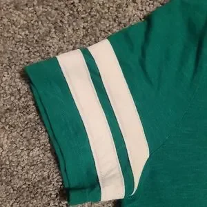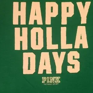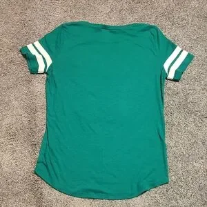 Cheerful PINK VS green tee with bold white lettering with gold around the edges. Ideal for festive occasions. Size medium. Vinyl in excellent shape.
