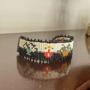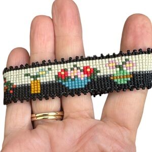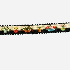 Add a touch of elegance and nature-inspired charm to your accessory collection with this exquisite handmade bracelet. Featuring intricately handcrafted potted flowers, this piece is set against a backdrop of meticulously loomed black and cream beads. The bracelet is accented with a scalloped edge in the color as the black beads.