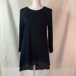 Gorgeous soft cotton top with sheer black underlay that peaks at the back split at bottom hem. Great with a skinny pant to get the full effect of the back split hem. Nice length to pair with a long line cardigan. High Low Cut, 3/4 Length sleeves, Crew Neck, pullover Style.