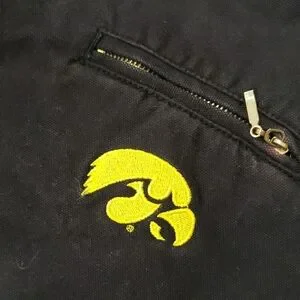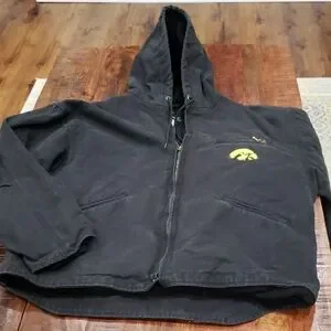 Vintage and retro cool Iowa Hawkeyes black hooded jacket with Iowa logo. Features front zipper and multiple pockets. Perfect for casual and work wear. Size medium or MR. Measurements included. Definitely a pre-loved, distressed vintage work coat.