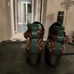 Step out in style with these chic embroidered ankle boots. Featuring a rich brown and green color palette, these boots are perfect for adding a touch of elegance to any outfit.