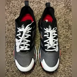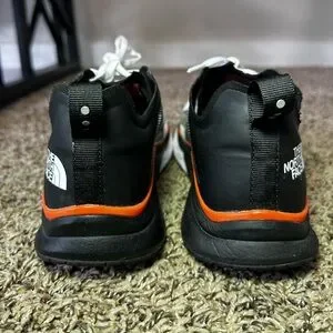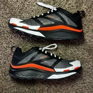 Sleek black and white design. Orange accents for a bold look. Durable and comfortable for athletic activities.