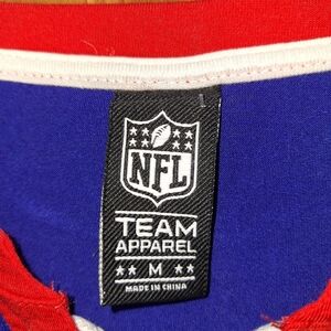 Stylish blue and red NFL Buffalo Bill's long sleeve shirt with lace-up front in a ladie's size medium. Features a bold logo on the chest. Active, athletic, athleisure, sports, football, fanatic, casual, streetwear.
