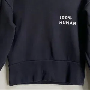 Everlane launched 100% Human as a way to bring people together amid the civil divisions following the 2016 election and advocate for the human rights of all. Black color. Pullover. Crew neck. Long sleeves with band cuffs. '100% Human' white print on chest. Band hem. French terry knit construction.
