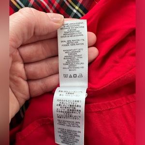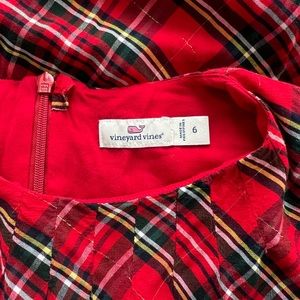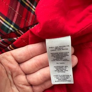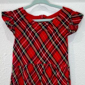 Charming red plaid dress. Features ruffled sleeves. Perfect for formal occasions.