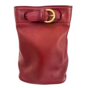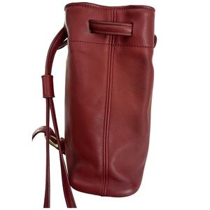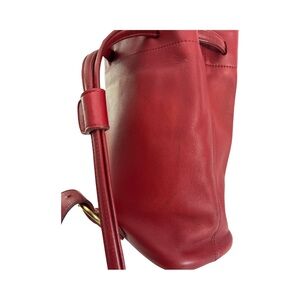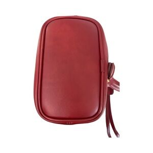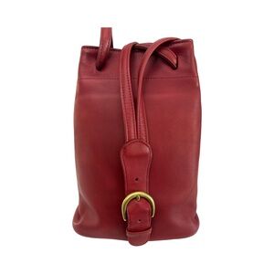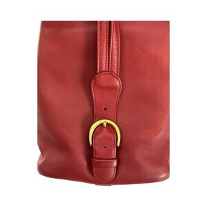 Elegant red leather backpack. Features adjustable straps and gold buckle detail. Perfect for everyday use.