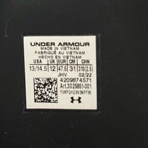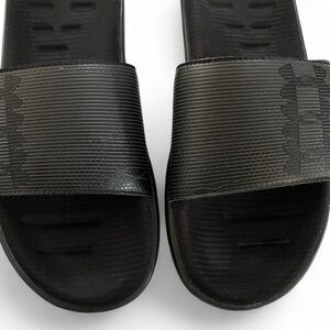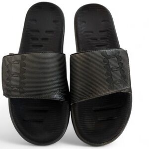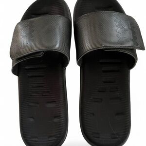 Stylish black footwear with a robust build. Perfect for active use. Black Under Armour slide sandals with adjustable strap fits men’s shoe size 13-14.5 one small flaw shown #outdoor