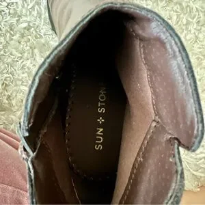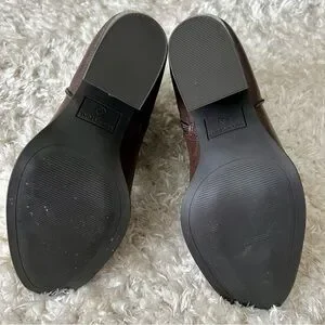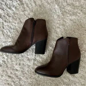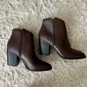 Elegant dark brown ankle booties with a sleek design. Features a sturdy block heel and side zipper for easy wear. Perfect for fall, winter and early spring, never worn