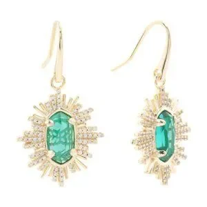 Drop earrings get a touch of vintage glamour in the Kendra Scott Grayson Sunburst Drop Earrings in Green Glass. A shimmering sunburst design beautifully frames an iconic stone shape, creating an art deco vibe. Lightweight for all-day wear yet elevated with extra sparkle, this pair is perfect for day-to-night styling.