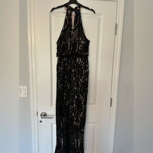 Chic black lace jumpsuit with halter neckline. Perfect for elegant evenings. Features intricate lace detailing. Very pretty when on. Used good condition. Ask me any question before purchasing because I rarely accept returns.