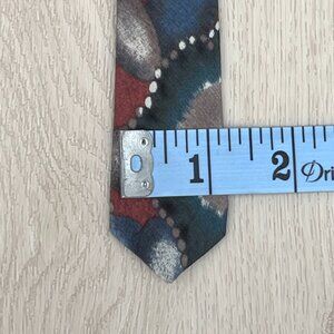It features an abstract print in a very 90s color palette of muted shades of rust, blue, teal, beige, grey and cream.