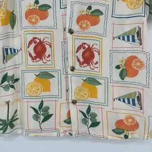 - Allover retro postcard-style print featuring citrus fruits, palm trees, sailboats, leaves, and red crabs in colorful framed blocks