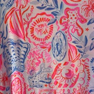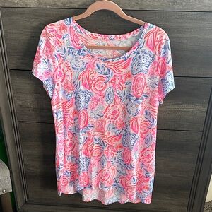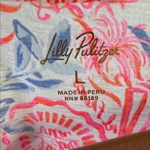 in the pattern Resort White Lil Sun Sea Sand. Easy fit, short sleeve, pullover tee with a scoop neck and a high-low hem. 26" in length. Skims the body. Roomier fit. Palm Beach Slub Jersey (100% Cotton). Size L