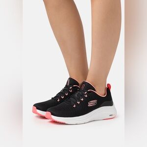 Stylish Skechers sneakers with black exterior and pink accents. Perfect for casual wear and workouts.