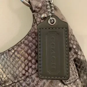 Stylish Coach shoulder bag with python print. Features silver and black tones. Perfect for any occasion.