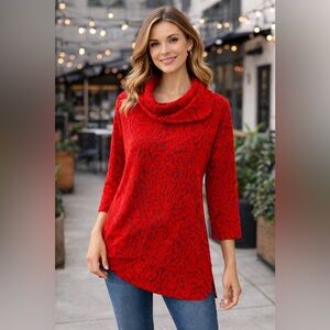 Elegant cowl neck sweater with bold red and black pattern. Perfect for adding flair to your outfit. Gorgeous top!